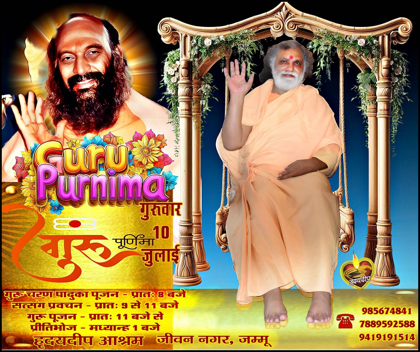 You all are cordially invited to perform Guru Pooja and receive blessings from Swami Ji on the aupicious day of Guru Purnima, which falls on 10th July, 2025 at Hridaydeep Ashram, Jeevan Nagar , Jammu.